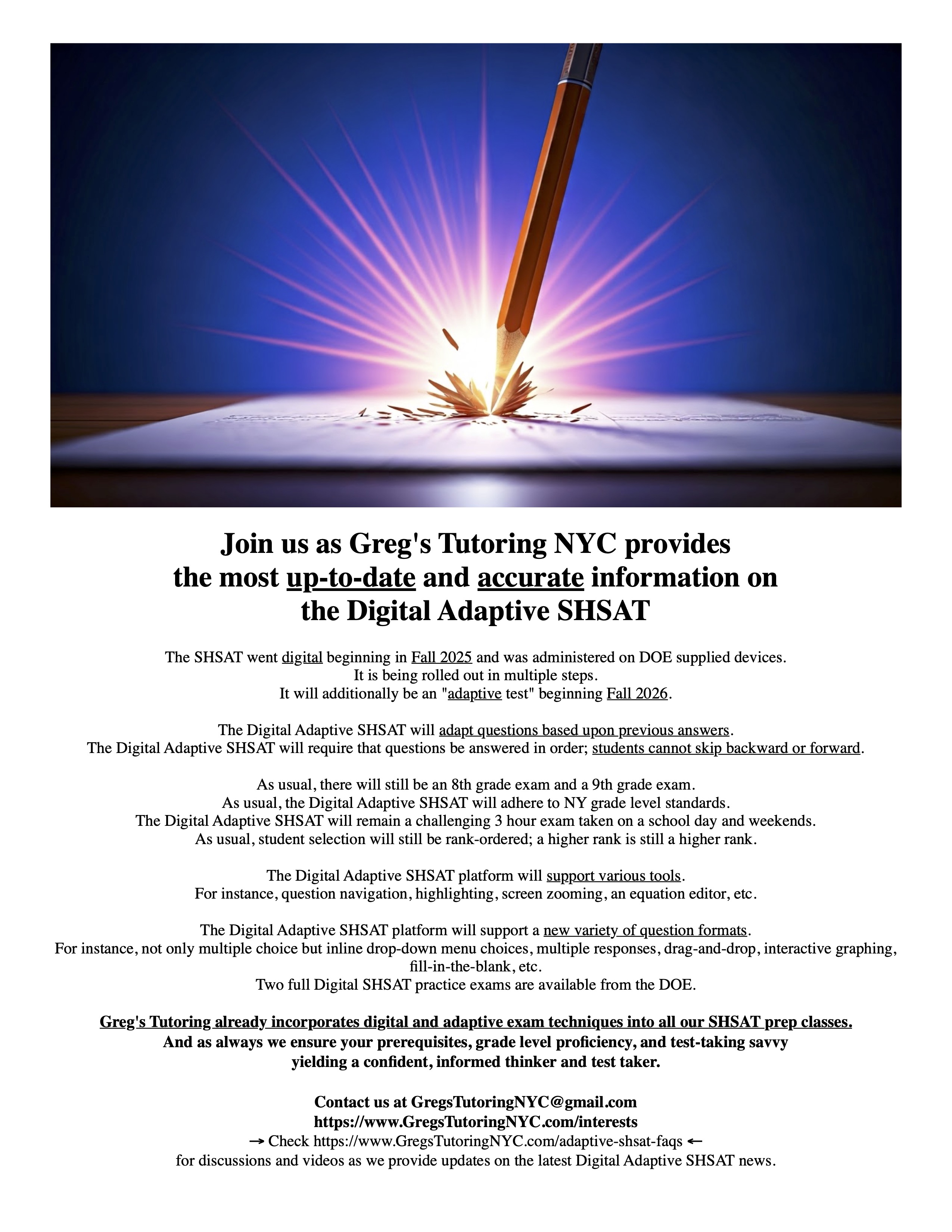 Greg's Tutoring NYC is working hard and will continue to bring you the latest and most accurate news on the digital SHSAT!